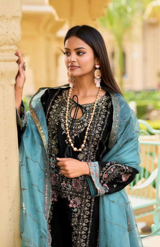 Black Unstitched Georgette Embroidered Suit – Organza Dupatta | Wedding & Festive Wear
