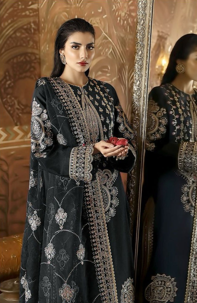 A timeless black unstitched suit designed for elegance and grandeur. This luxurious three-piece set features heavy embroidery on georgette, a Santoon bottom for structure and comfort, and a delicate organza silk dupatta with exquisite embroidery, making it a perfect choice for weddings, receptions, and festive occasions.